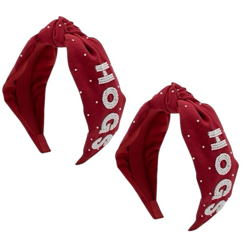Top off your game day look with a touch of sparkle and serious Razorback pride! This Rhinestone “HOGS” Knotted Headband features bold cardinal red fabric, shimmering rhinestone lettering, and a trendy knotted design — the perfect accessory for every Arkansas fan.