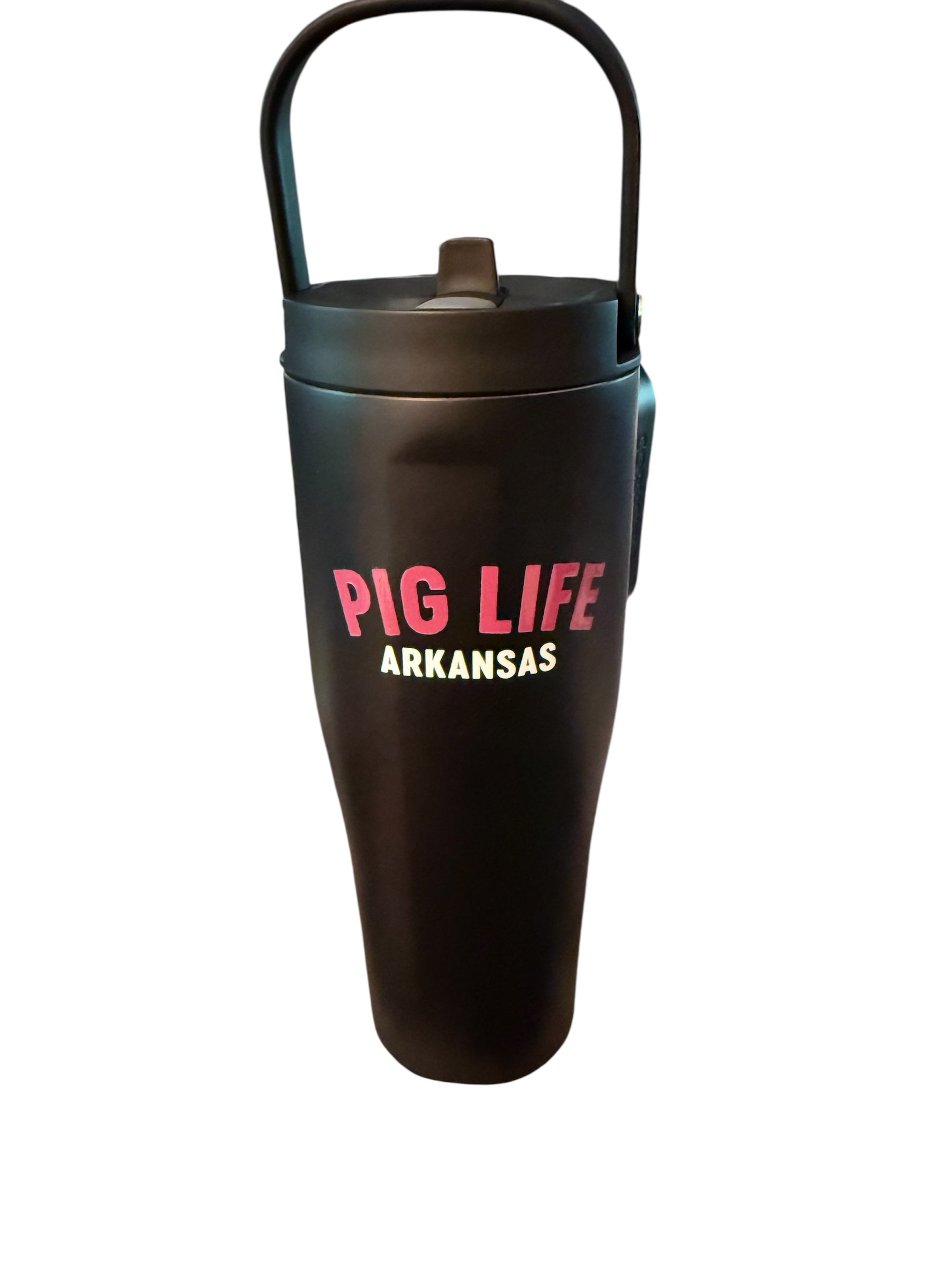 Fuel your day Razorback style with the 30oz Pig Life Arkansas tumbler in matte black. Built for serious hydration and Hog pride, this tumbler features a durable flip-up straw lid and sturdy carry handle—perfect for travel, workouts, tailgates, and everyday hustle.