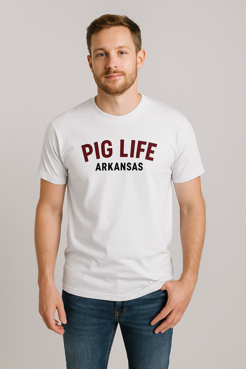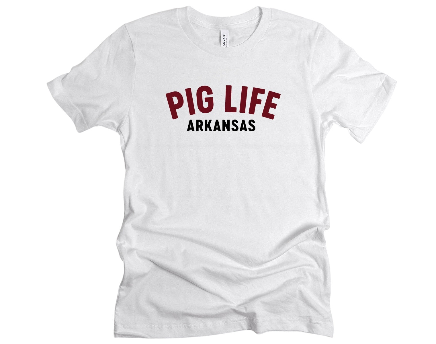 Rep your Arkansas pride in this classic white “Pig Life Arkansas” tee. Featuring bold cardinal red and black lettering, this unisex shirt is soft, lightweight, and ready for game days, tailgates, and everyday wear. Whether you’re shouting Woo Pig Sooie or just living the Pig Life, this shirt has you covered.